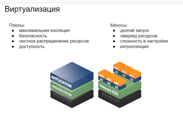 При необходимости виртуализации системы с гарантированно выделенными ресурсами и виртуальным аппаратным обеспечение, стоит выбрать VM. Что даёт использование VM:
