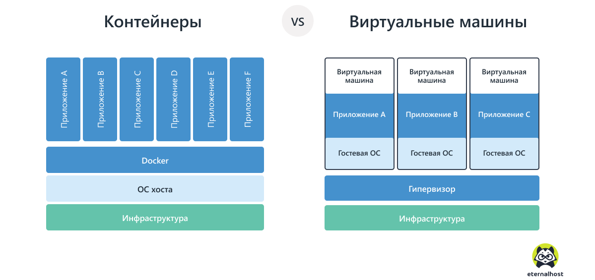 - контейнеры разделяют ядро системы, работая как отдельный процесс основной ОС;