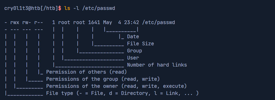 execute, сокращённо(x)- нужно для того, чтобы пользователь мог посетить каталог и просмотреть содержимое, а также запустить файл (иначе появится предупреждениеPermission Denied)read, сокращённо(r)- нужно для того, чтобы пользователь мог читать файлыwrite, сокращённо(w)- нужно для того, чтобы можно было изменять содержимое каталога (создавать, удалять, переименовывать файлы)