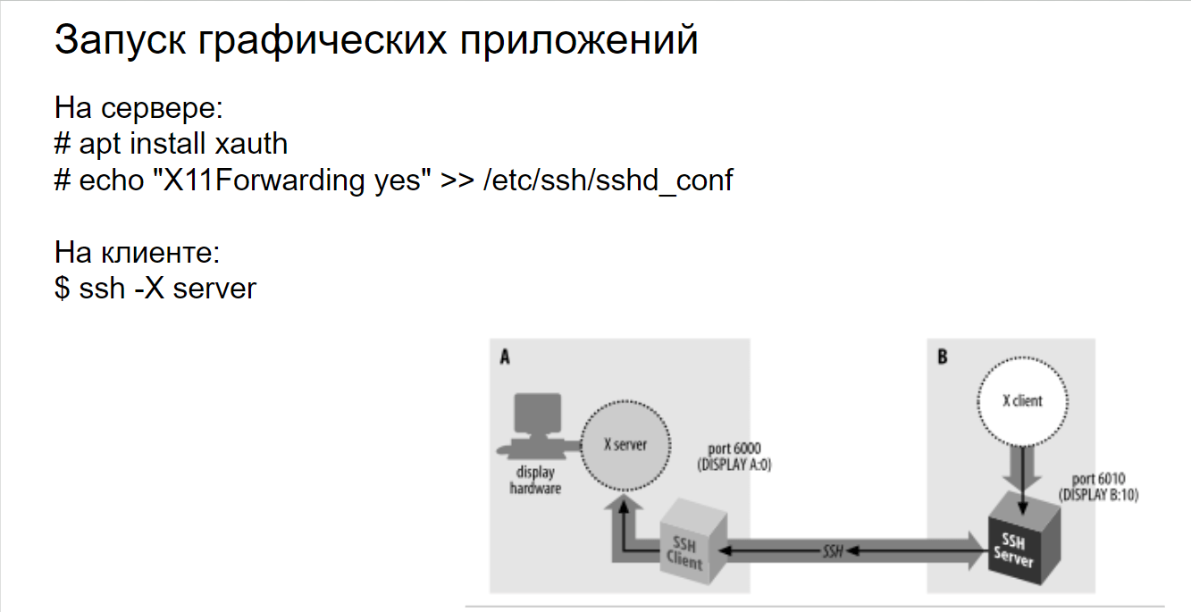 Подключение к серверу с включённым X11 Forwarding: $ ssh -X user@server_address